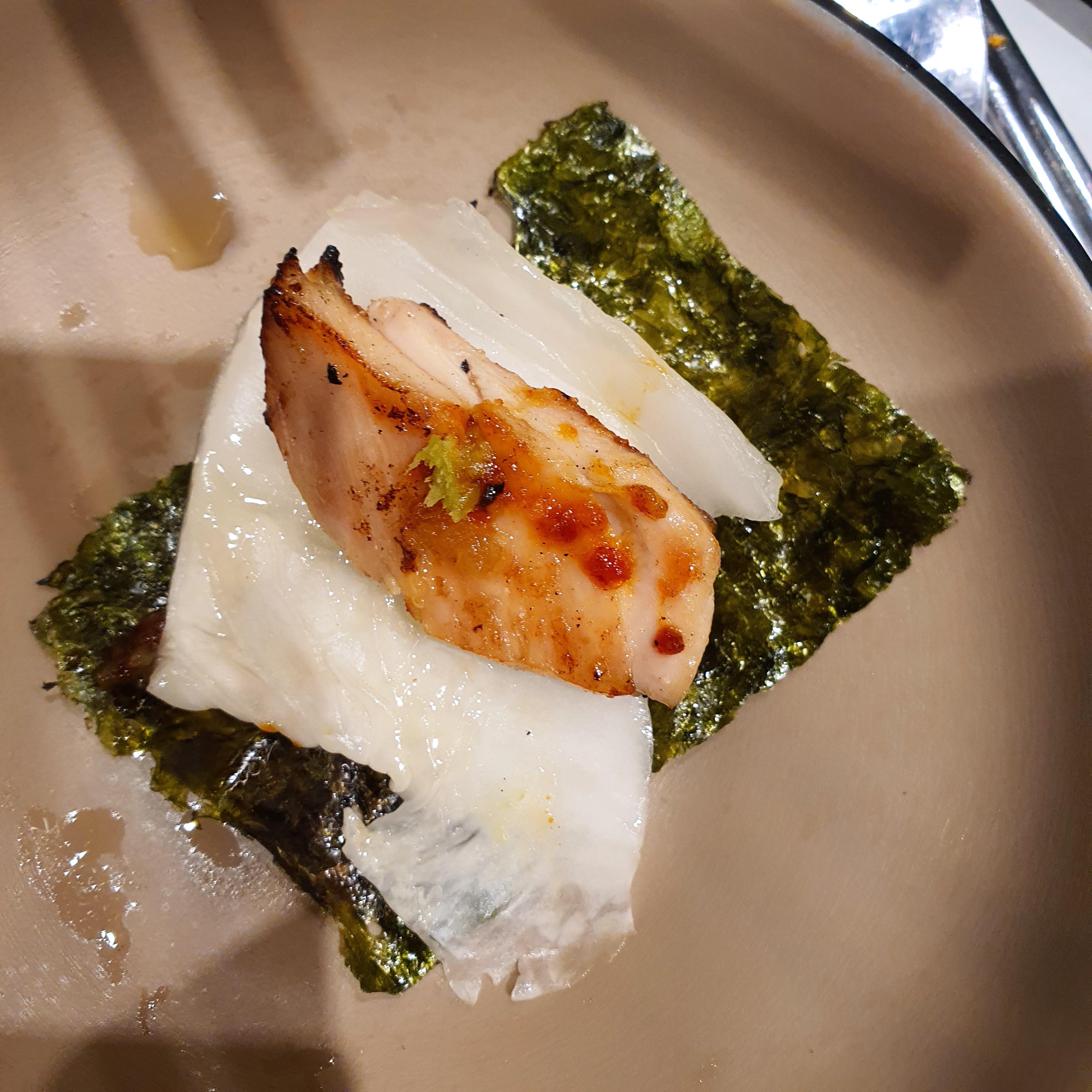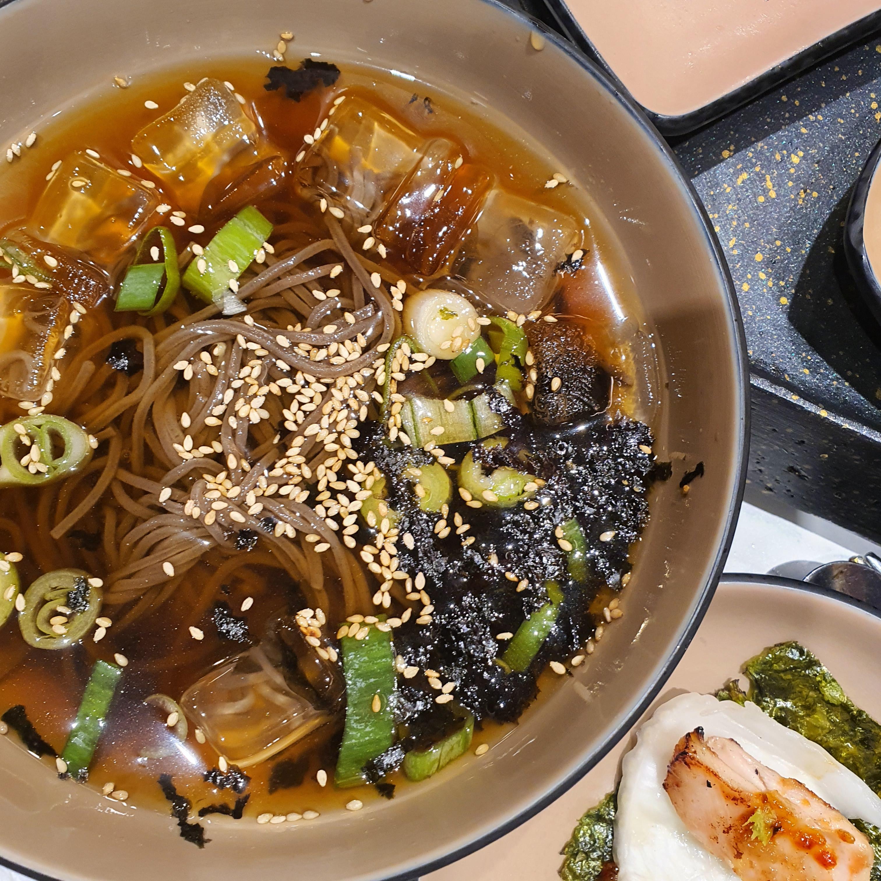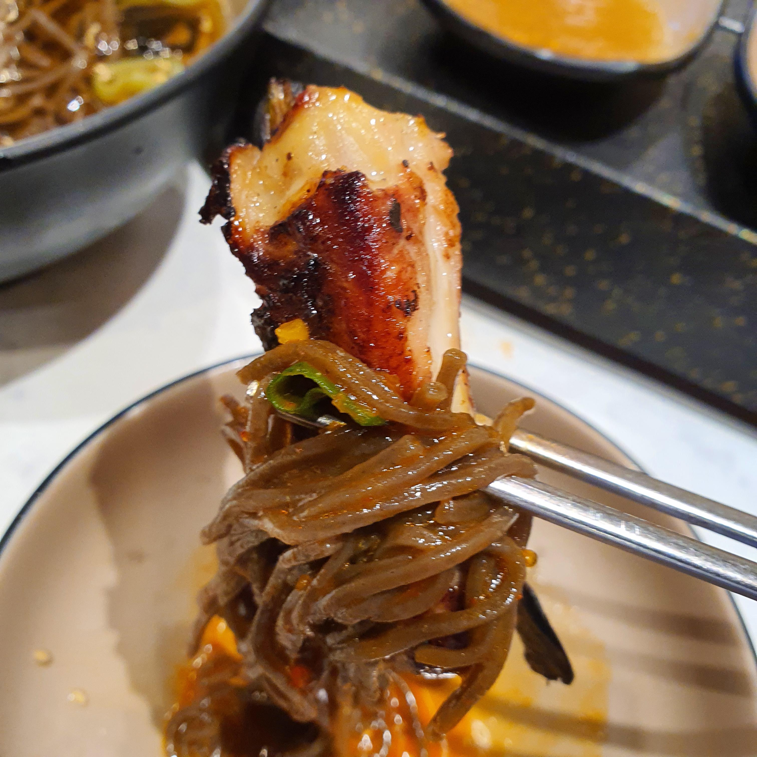 닭갈비는 김에 싸먹는게 팔각도에서는 기본이라고 하네요. 확실히 고소한 김과 짭짤한 간장숯불닭갈비가 잘 어우러지는것 같아요. 메밀국수에도 싸먹고 백김치에 와사비도 얹어서 먹어보고 다양하게 즐길 수 있어 재미있게 먹었습니다.
