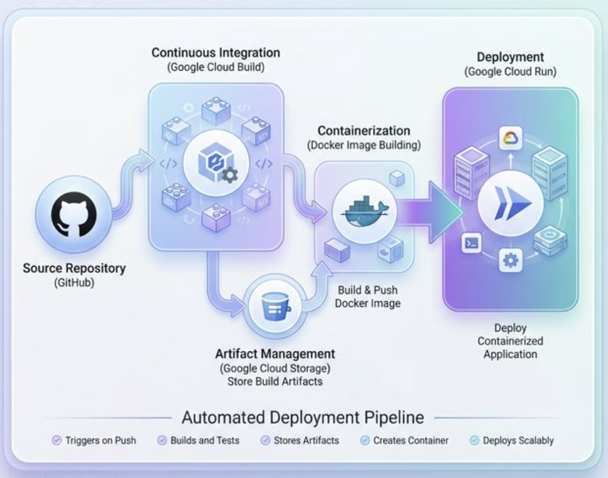 - CI/CD 자동화: Cloud Build를 사용하여 GitHub 푸시 한 번으로 빌드부터 배포까지 완전 자동화 구현.